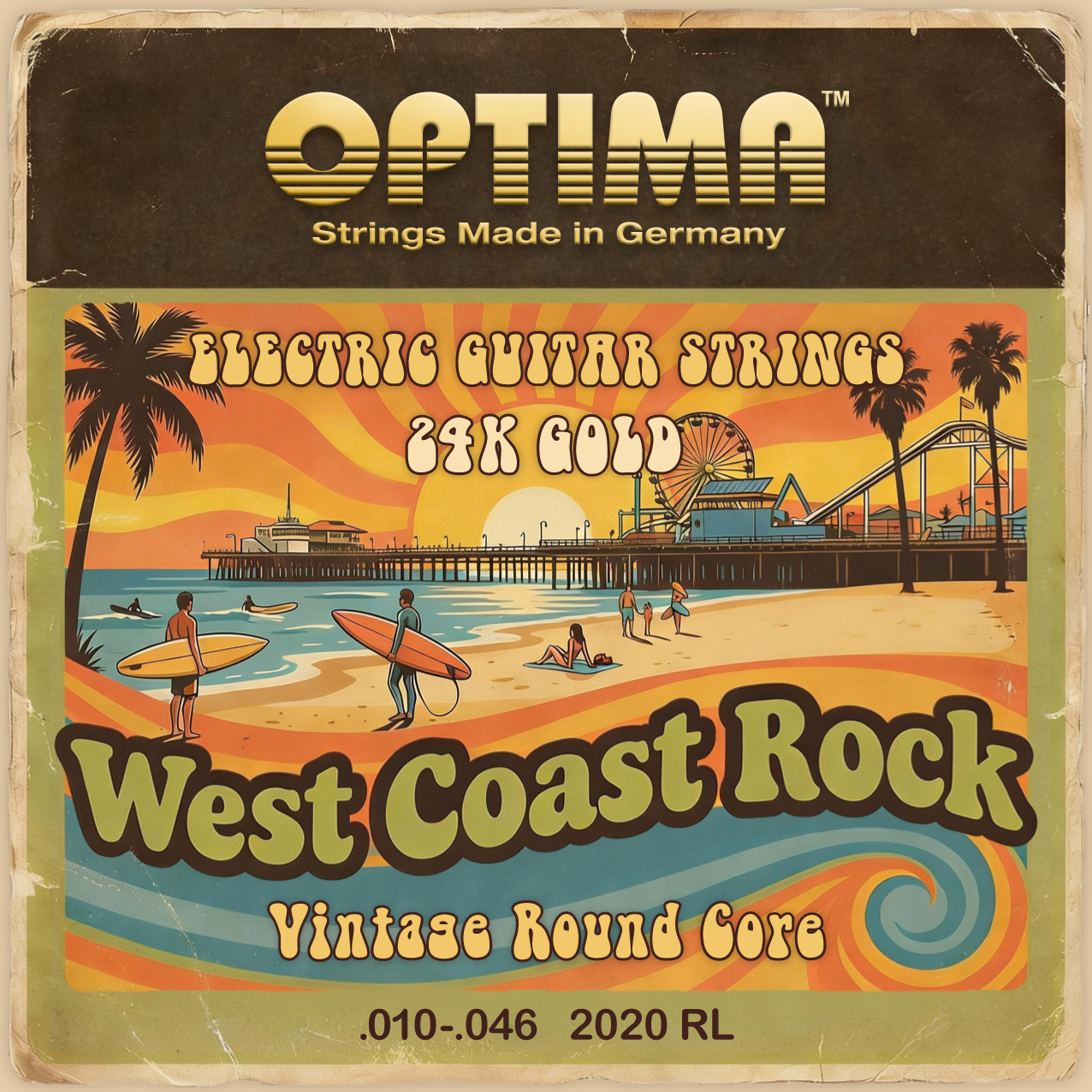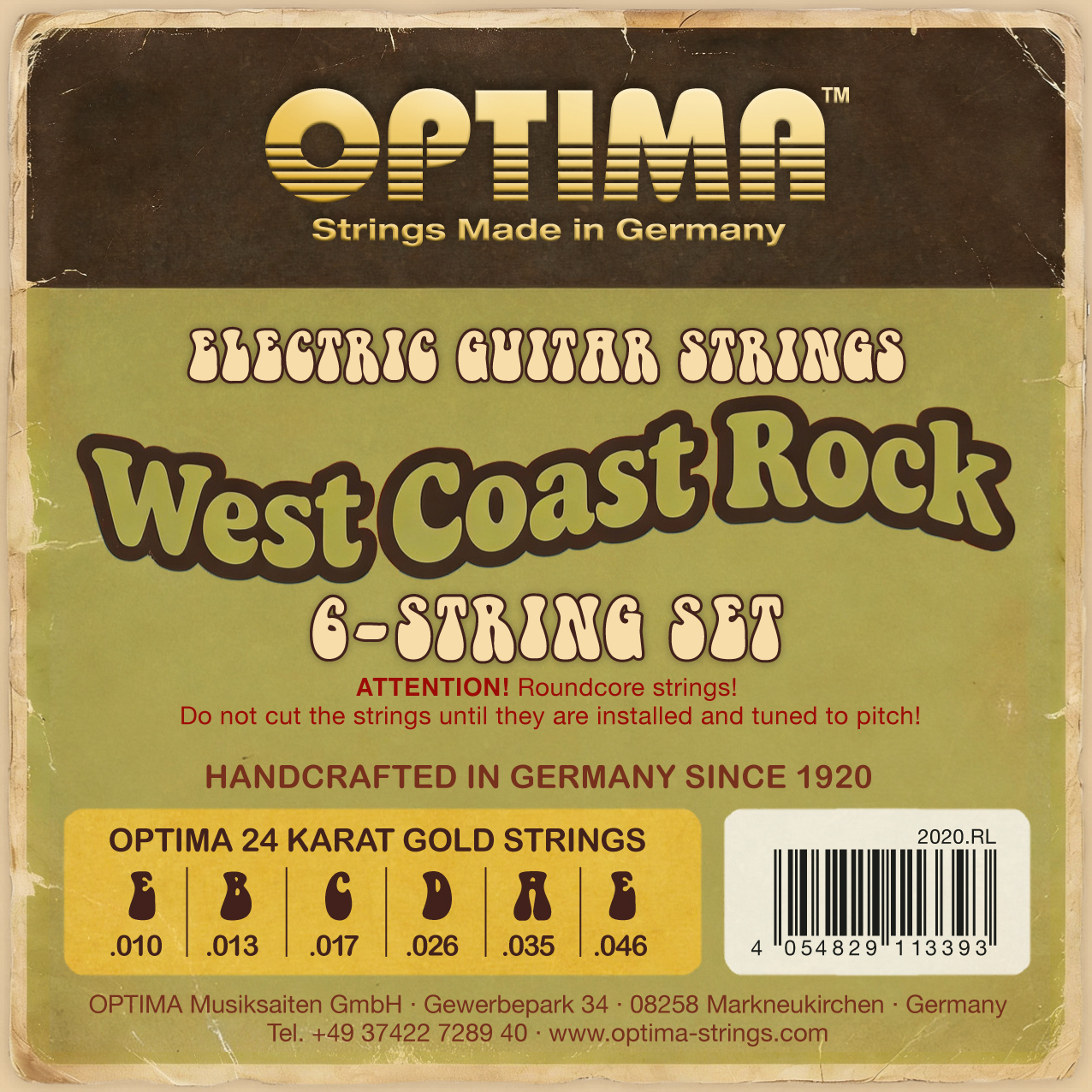 Die neuen West Coast Rock Electric Guitar Strings in 24K vergoldeter Ausführung ist eine Hommage an den goldenen Sound der amerikanischen Westküste. Inspiriert von den legendären Rockgitarren der sechziger und siebziger Jahre verbindet dieser Saitensatz echtes Vintage Feeling mit modernem Spielkomfort.